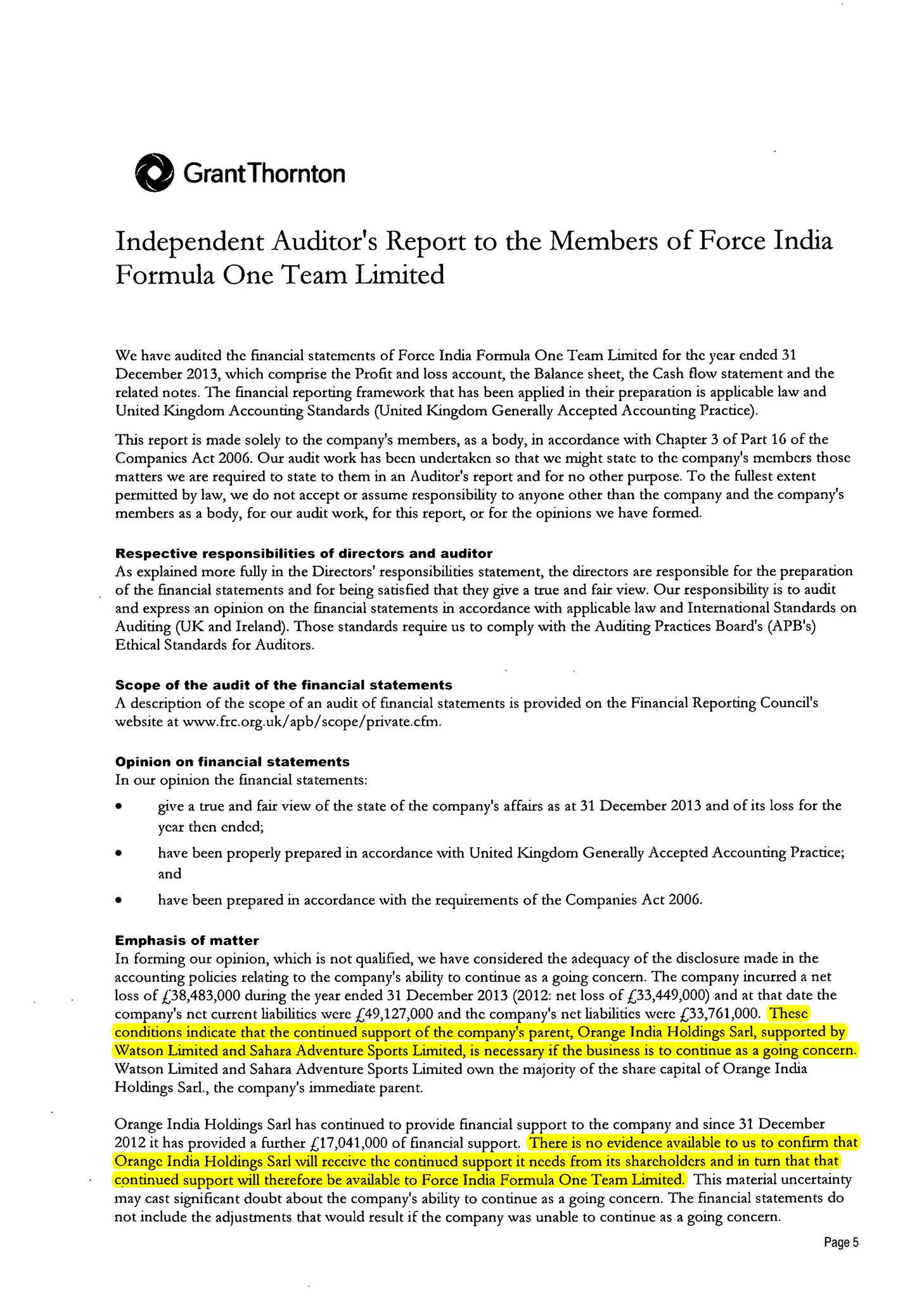 The trio's investment vehicle, Orange India Holdings, paid £17m to the team last year according to its accounts for the year-ending 31 December 2013. However, as can be seen from this page in the accounts, the team's auditor, John Corbishley of Grant Thornton, believes "there is no evidence available to us to confirm that Orange India Holdings Sarl will receive the continued support it needs from its shareholders and in turn that that continued support will therefore be available to Force India Formula One Team Limited. This material uncertainty may cast significant doubt about the company's ability to continue as a going concern."